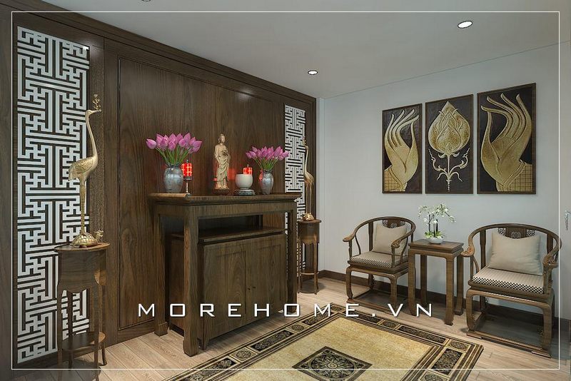 Mẫu thiết kế phòng thờ biệt thự đẹp với bộ bàn thờ gỗ sồi màu nâu sang trọng, cuốn hút mội ánh nhìn