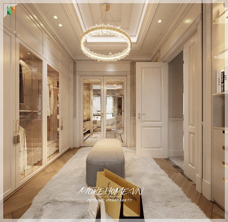 Tổng thể phòng thay đồ được thiết kế tone màu trắng chủ đạo diện tích được nới rộng hơn không gian thông thoáng sang sạch đẹp và thẩm mỹ cao