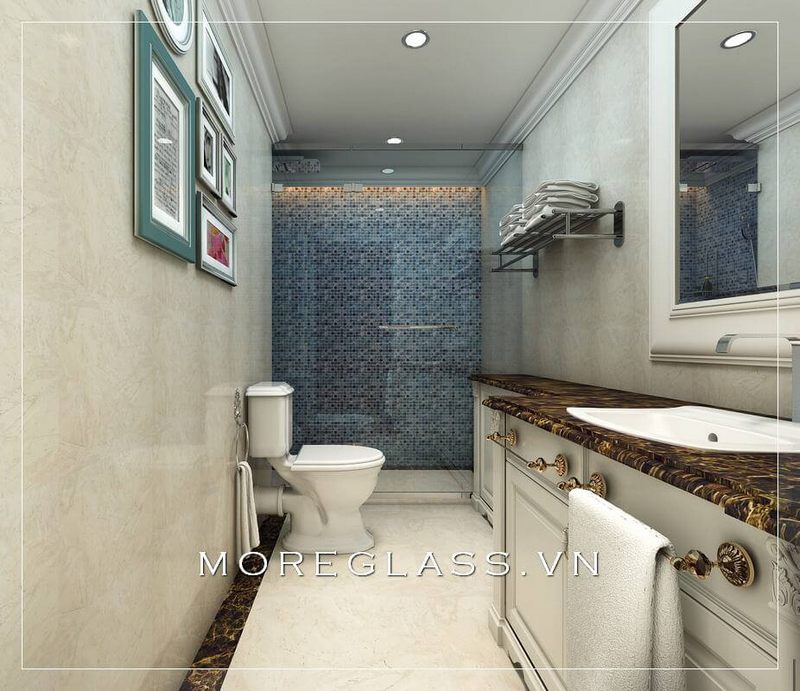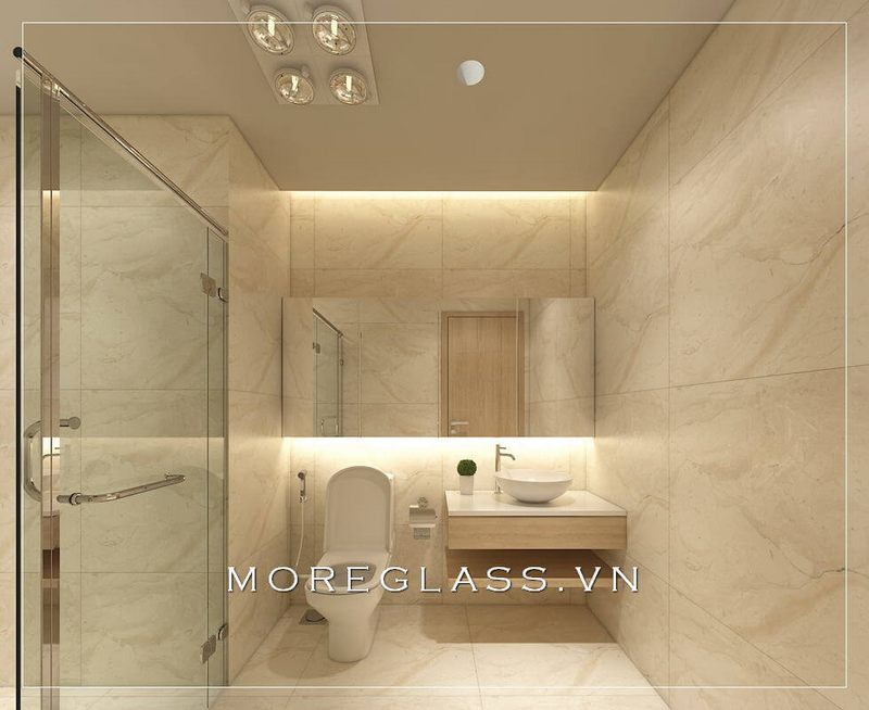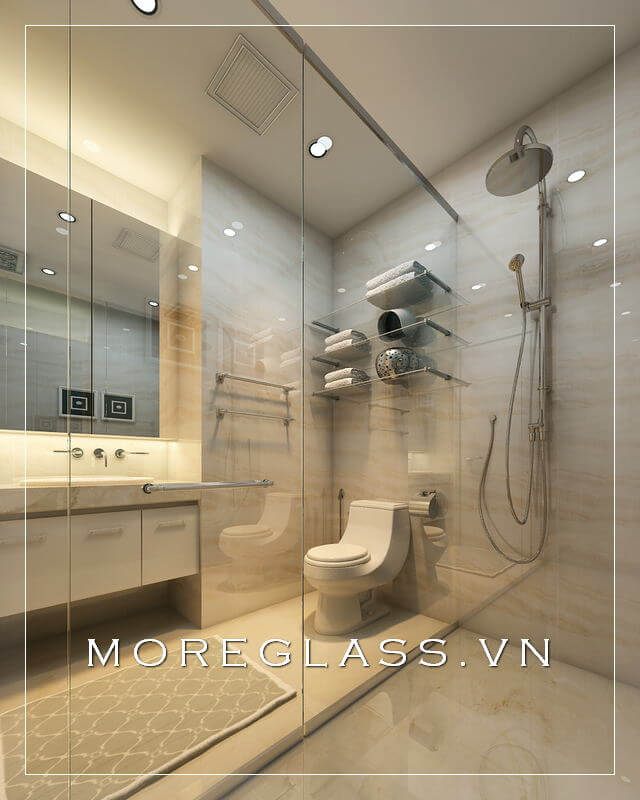 Gia chủ thích thiết kế phòng tắm sang trọng bằng cách sử dụng vách tắm kính kết hợp với đồ nội thất và các thiết bị vệ sinh hiện đại.
