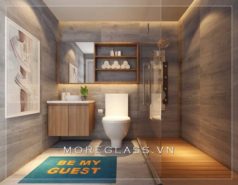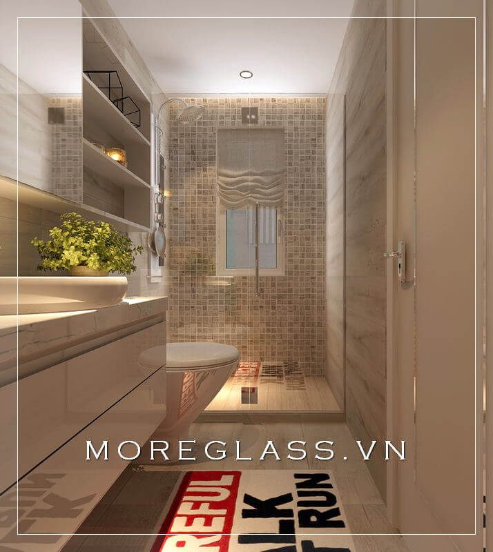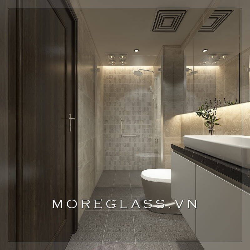 Chung cư được trang bị một phòng tắm nhỏ với sử dụng vách kính nhà tắm để tách riêng không gian tắm và khu vệ sinh, giúp cung cấp cho căn phòng tắm tiện nghi hơn.