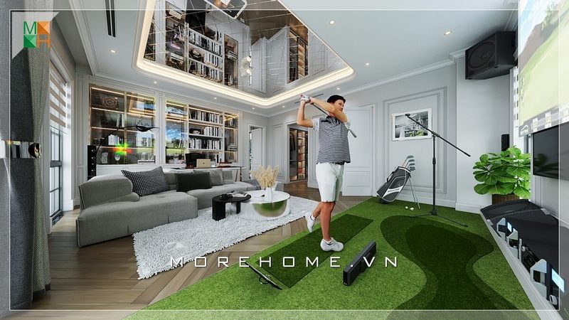 Sofa vải êm ái và sân golf nhỏ đẹp độc đáo được bố trí trong phòng khách chung cư thông tầng, mang lại cho mọi người cảm giác gần gũi và sáng tạo.