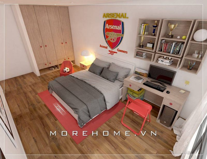 Phòng ngủ của bé trai cá tính và năng động được trang bị nội thất đơn giản, hiện đại nhưng không quá rườm rà. Chi tiết chiếc ghế và thảm trải màu đỏ tạo nên một điểm nhấn cho cả căn phòng.